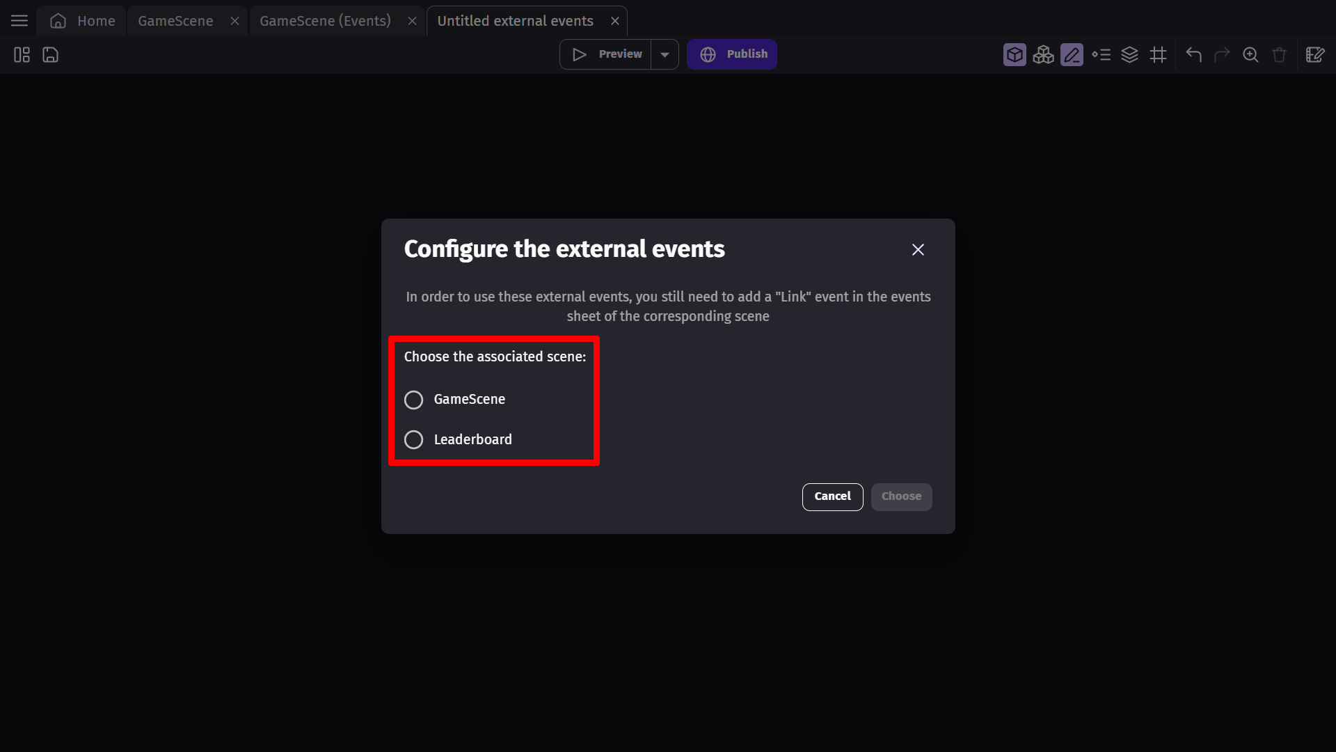 In order to finish the creation of an external events sheet, you must select a scene for it. This is the scene from which all object selections are based; in other words, you'll be able to select objects for an event in this external event sheet from the scene you've chosen.