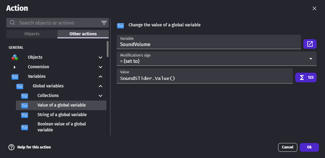 Sliders allow the player to pick a value between a maximum and a minimum range. This can be useful to change the music or sound effect volume, set the power of an attack, modify the speed of a car.