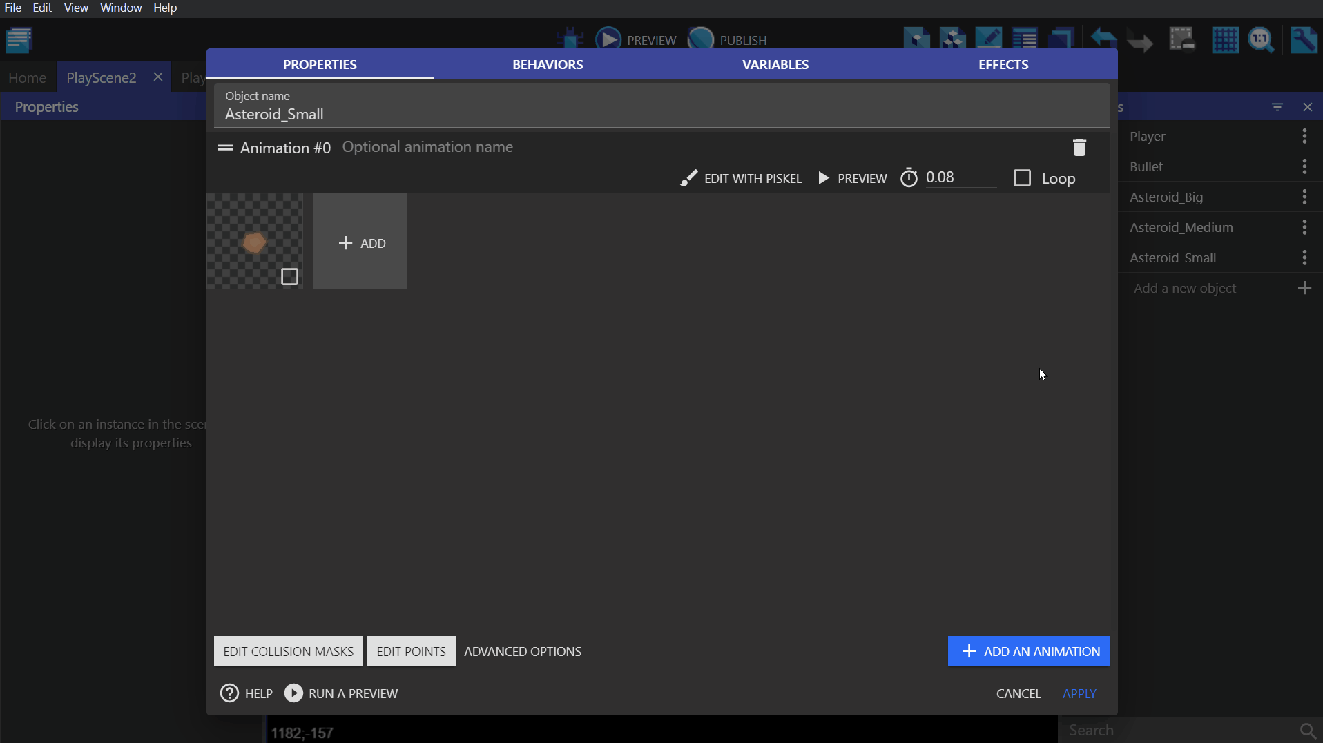 Go back to your game scene and create 3 different sprite objects. -1 called "AsteroidBig" with a single big asteroid image. -1 called "AsteroidMedium" with a single medium asteroid image. -1 called "AsteroidSmall" with a single small asteroid image.