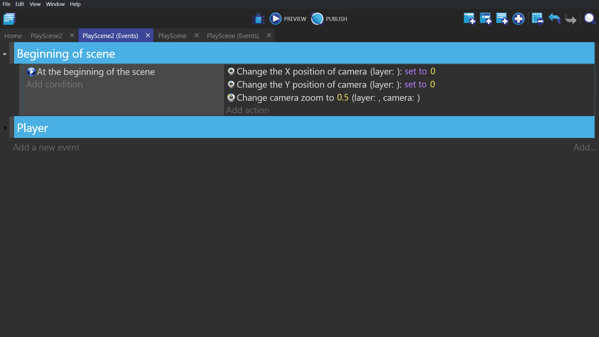 Create an event group, and call it "Beginning of scene".\ Inside this group, create an event with the following conditions/actions: