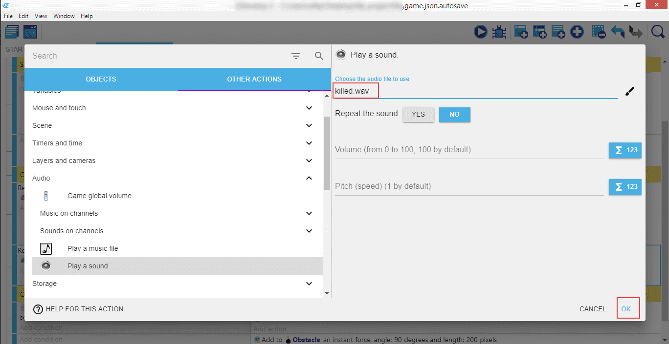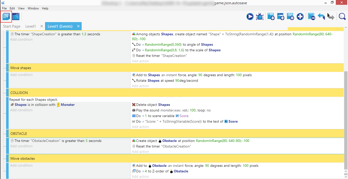This will allow us to have a specific condition "Repeat for each Obstacle object".