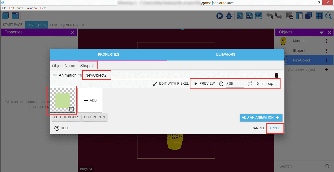 Do the same for the second shape: "Shape2" as the name, "NewObject2" as the animation, and a square image, then "Apply".