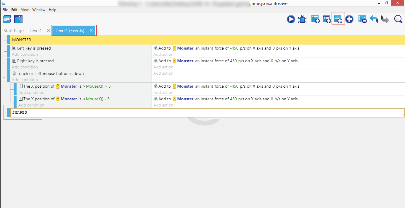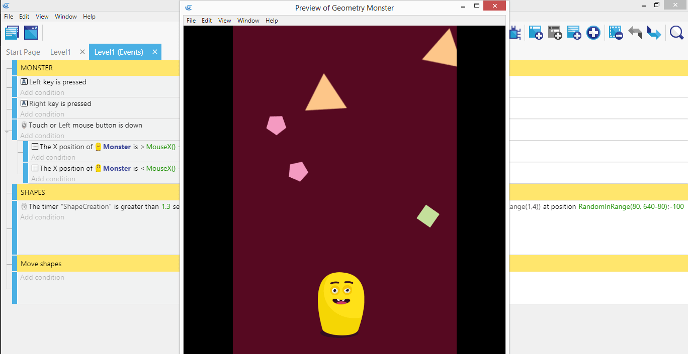 After successfully implementing the movement of the Monster it would be great to add the shapes that will be falling down, and move them down onto the scene.